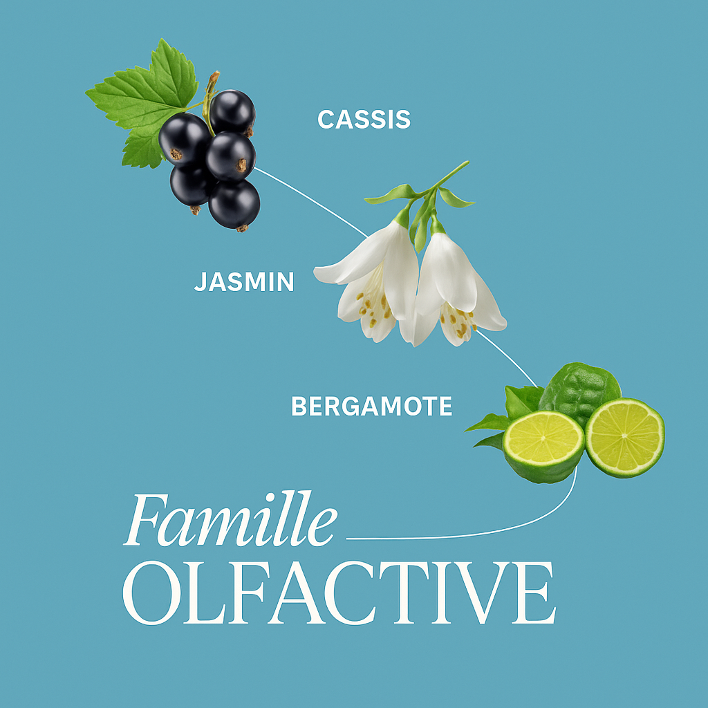 Les notes de bergamote et de cassis apportent une touche énergisante, tandis que le bouquet floral-fruité laisse une empreinte douce et joyeuse, moderne et féminine, qui reste délicatement sur la peau toute la journée.
