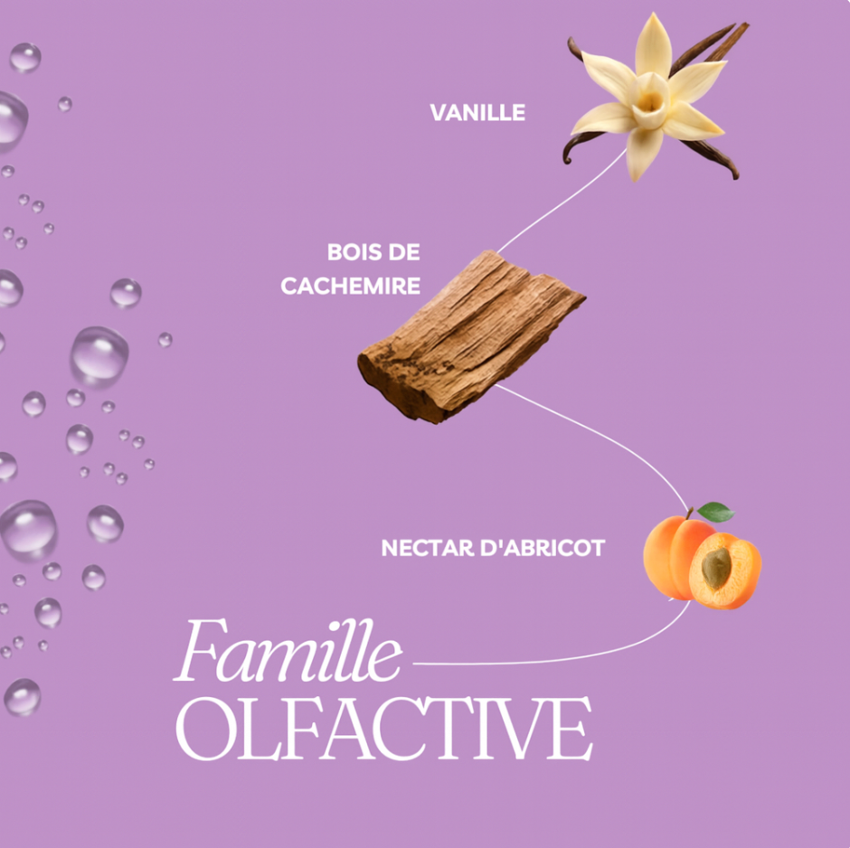Un voile parfumé où l’abricot fruité s’unit à la sensualité du musc blanc et à la chaleur du bois de cachemire. Raffinée et lumineuse, chaque vaporisation révèle un sillage envoûtant qui dure toute la journée.